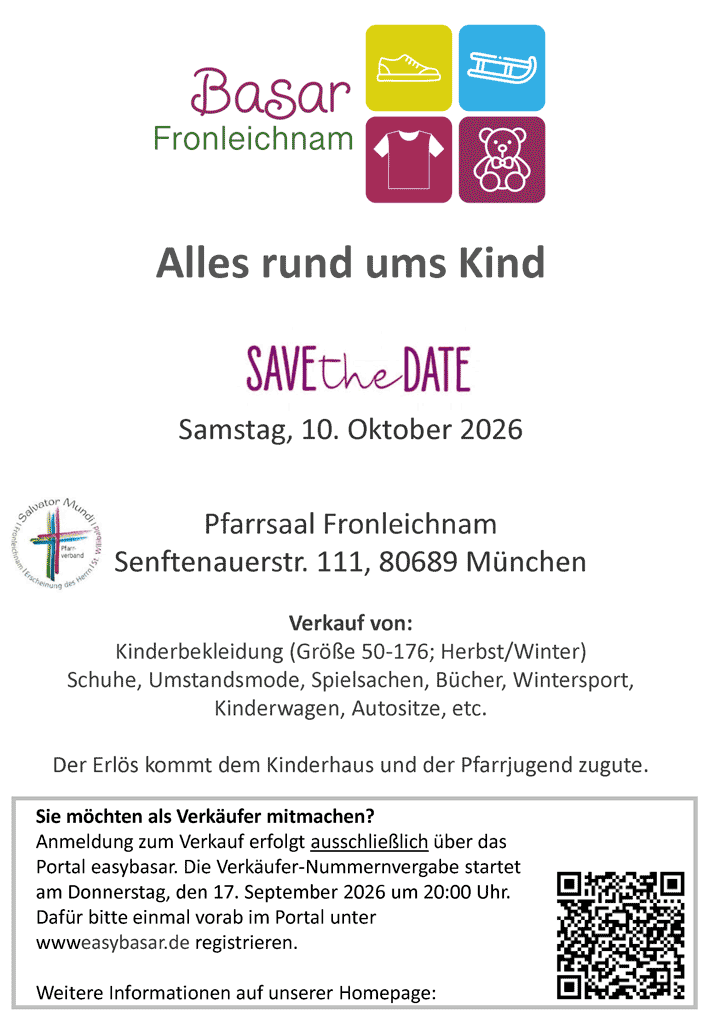 Der beliebte Basar Fronleichnam findet zweimal im Jahr statt. Verkauft werden Kindersachen, wie z.B. Kleidung, Schuhe, Bücher, Spielsachen, etc. Der Erlös wird für neue Projekte an die Jugendgruppe und dem Kinderhaus von Fronleichnam gespendet.